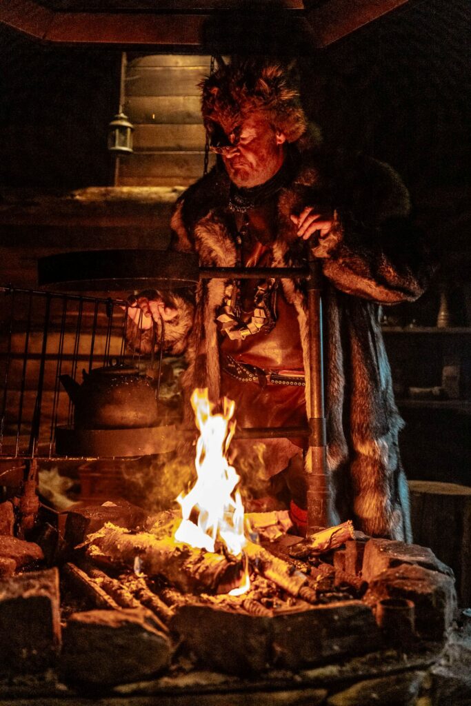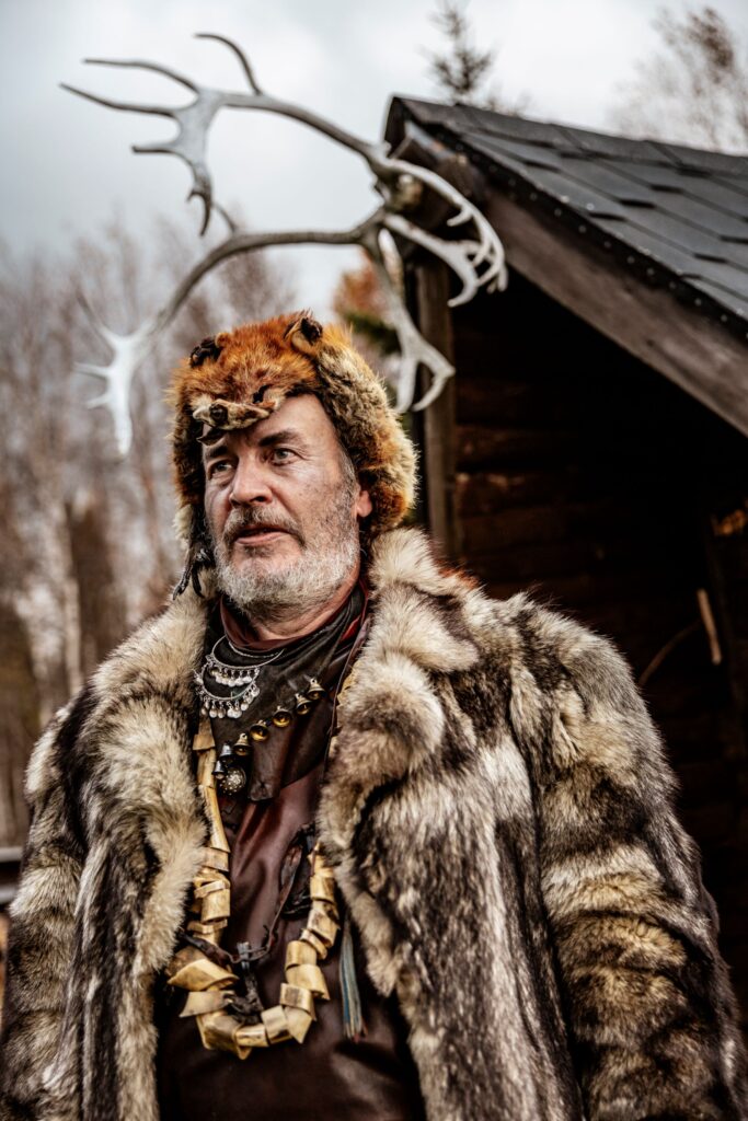 After a refreshing dip in the crystal-clear lake, we’re rejuvenated and ready for a spiritual encounter. A genuine Lappish shaman welcomes us for an audience in his log cabin. The lakeside atmosphere couldn’t be more fitting. The sun shines dramatically between clouds and the treeline, and a cool breeze whips across our faces.