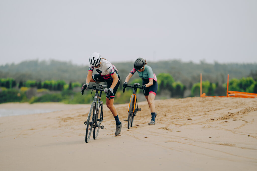 The expo, set on the Batemans Bay footy field right on the cusp of the beach, featured a Velosolutions-crafted pump track and a dedicated jump line with airbags to refine your airtime. Many race events start and finish around the expo, but none are more immersive than the EOtterX and Muc Off Ottercross races. Today saw the Muc Off Ottercross – Sea Otter’s cyclocross event – complete with a beach section, plenty of running, and a massive ramp ride-over to finish. Neat!